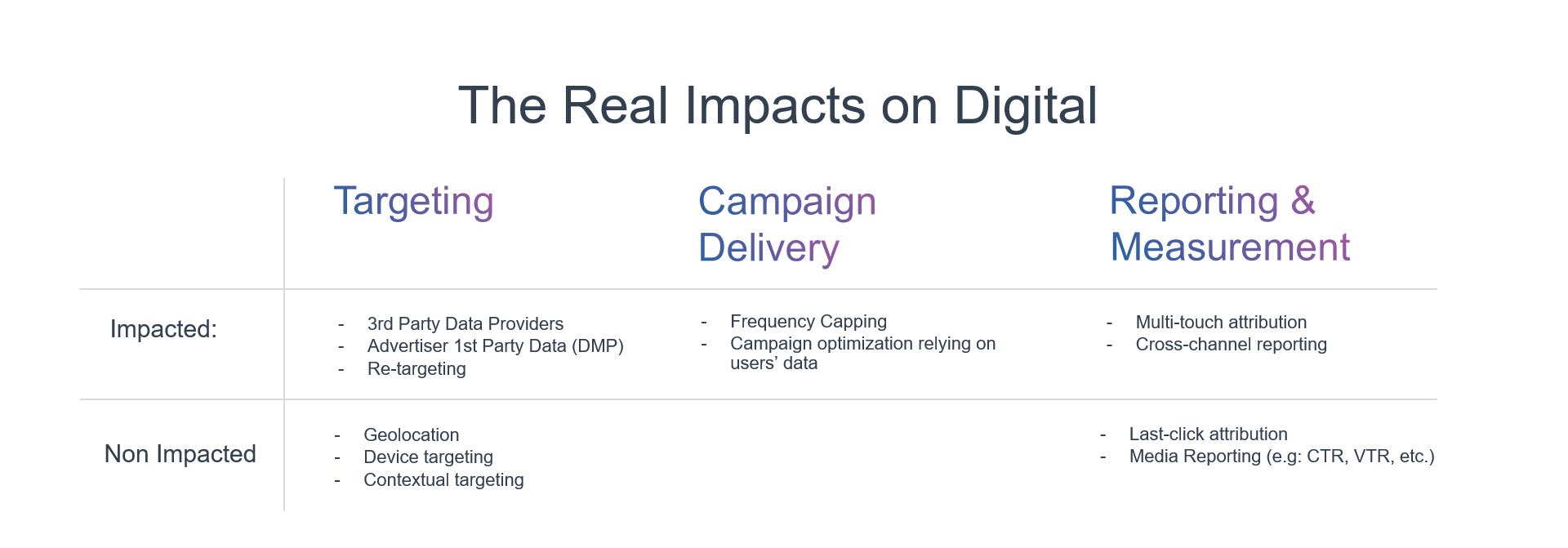 Adtech platforme ne bodo mogle preslikati ustreznega uporabnika za prikaz oglasov v brskalniku, saj sinhronizacija piškotkov ne bo več mogoča, zato je treba njihovo ciljanje, frekvenco ciljanja in sledenje konverzijam obravnavati z drugačnim pristopom.